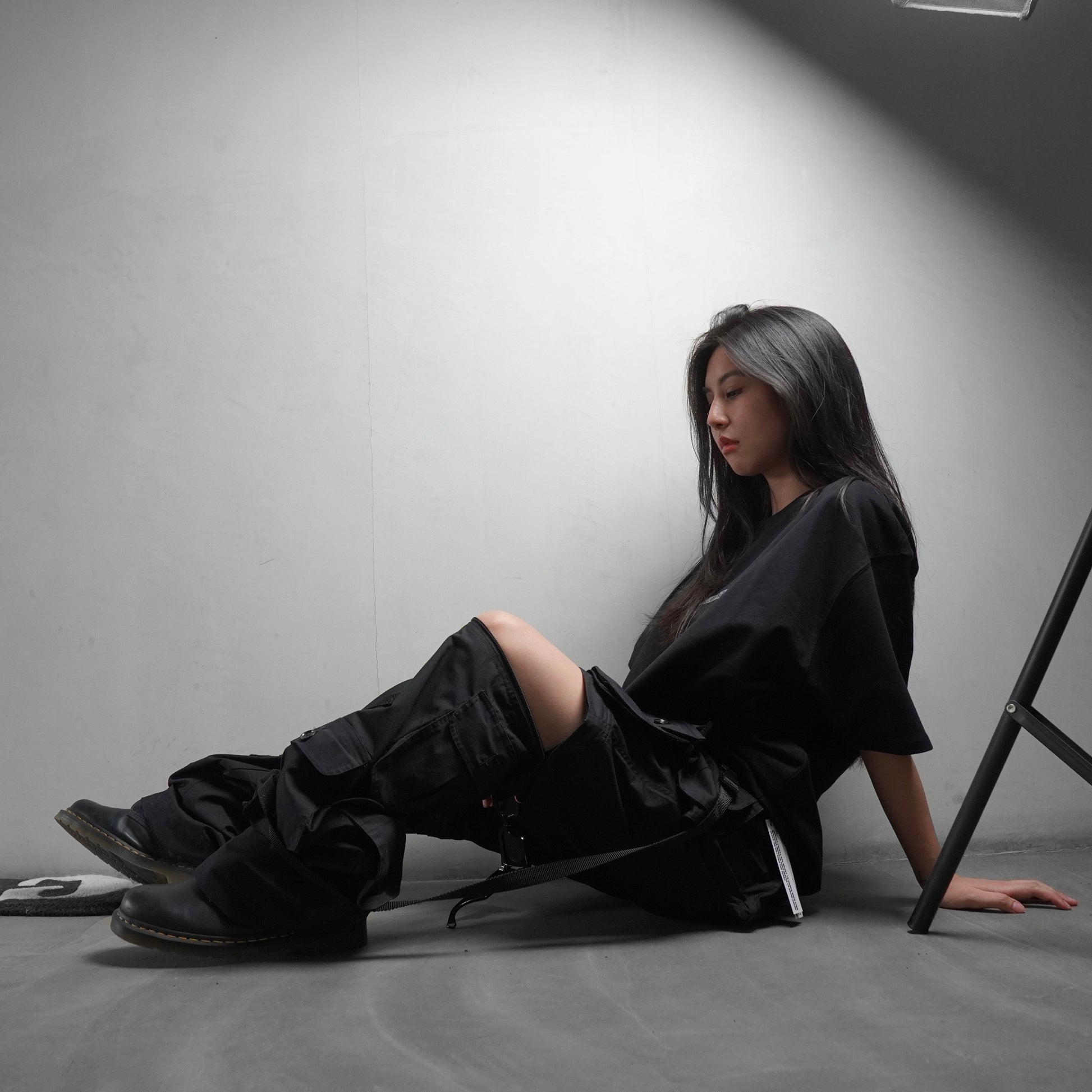 Bluorng black ripstop cargo is in black colour. The design is inspired from Bluorng’s take on cargos. The material is premium quality and textured; doesnt rip. The cargos are convertible into shorts and can be styled in multiple ways. There are 2 detachable pockets, low hanging suspenders on each side and 12 more multipurpose pockets. The fit is a Bluorng’s baggy flared fit.