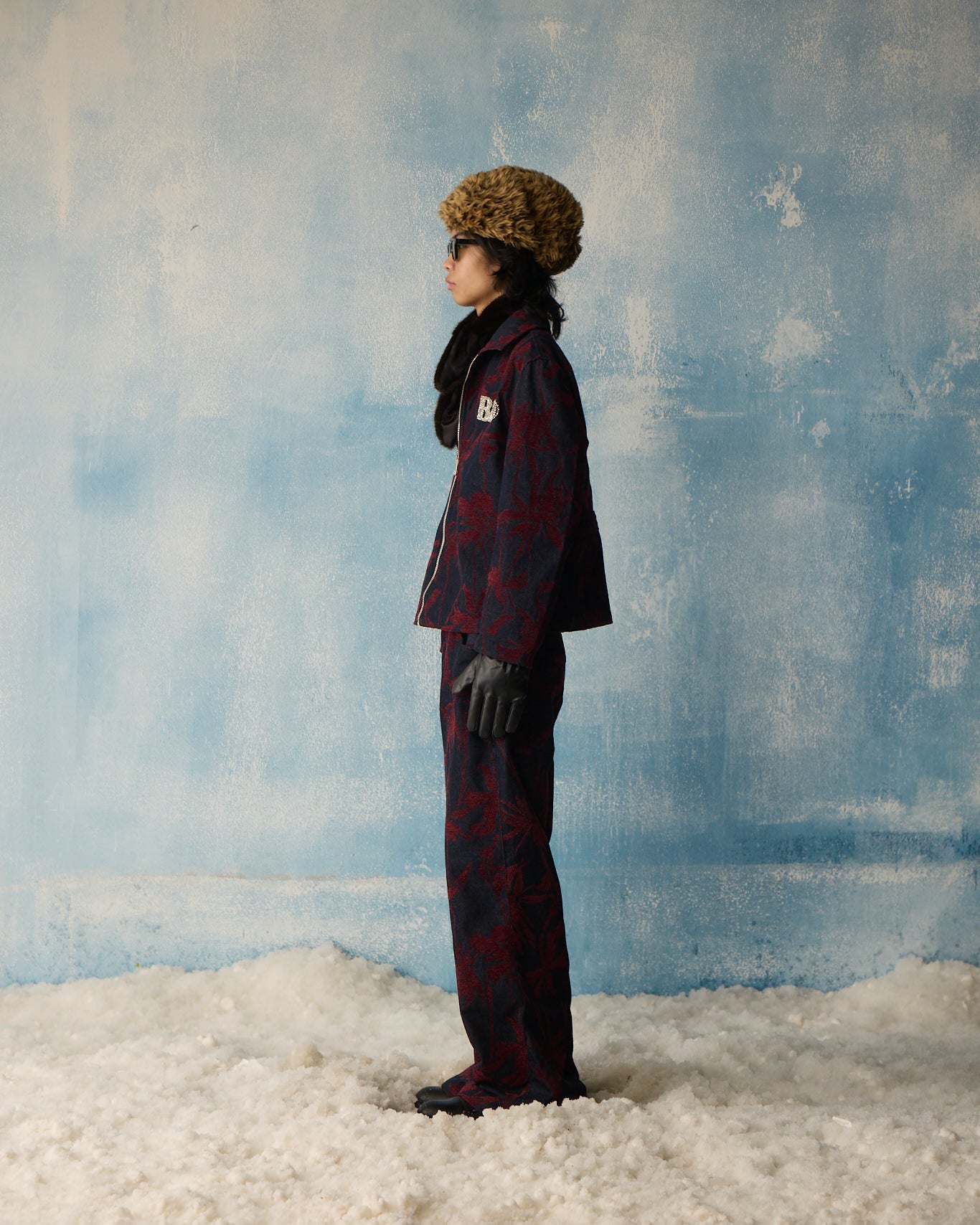 THE DENIM PANTS BY BLUORNG ARE PREMIUM, OVERSIZED, UNISEX PANTS MADE WITH 34% COTTON / 66% POLYESTER CORDUROY-TEXTURE FLORAL MOTIFS DENIM, FEATURING THE ICONIC BLUORNG LOGO.