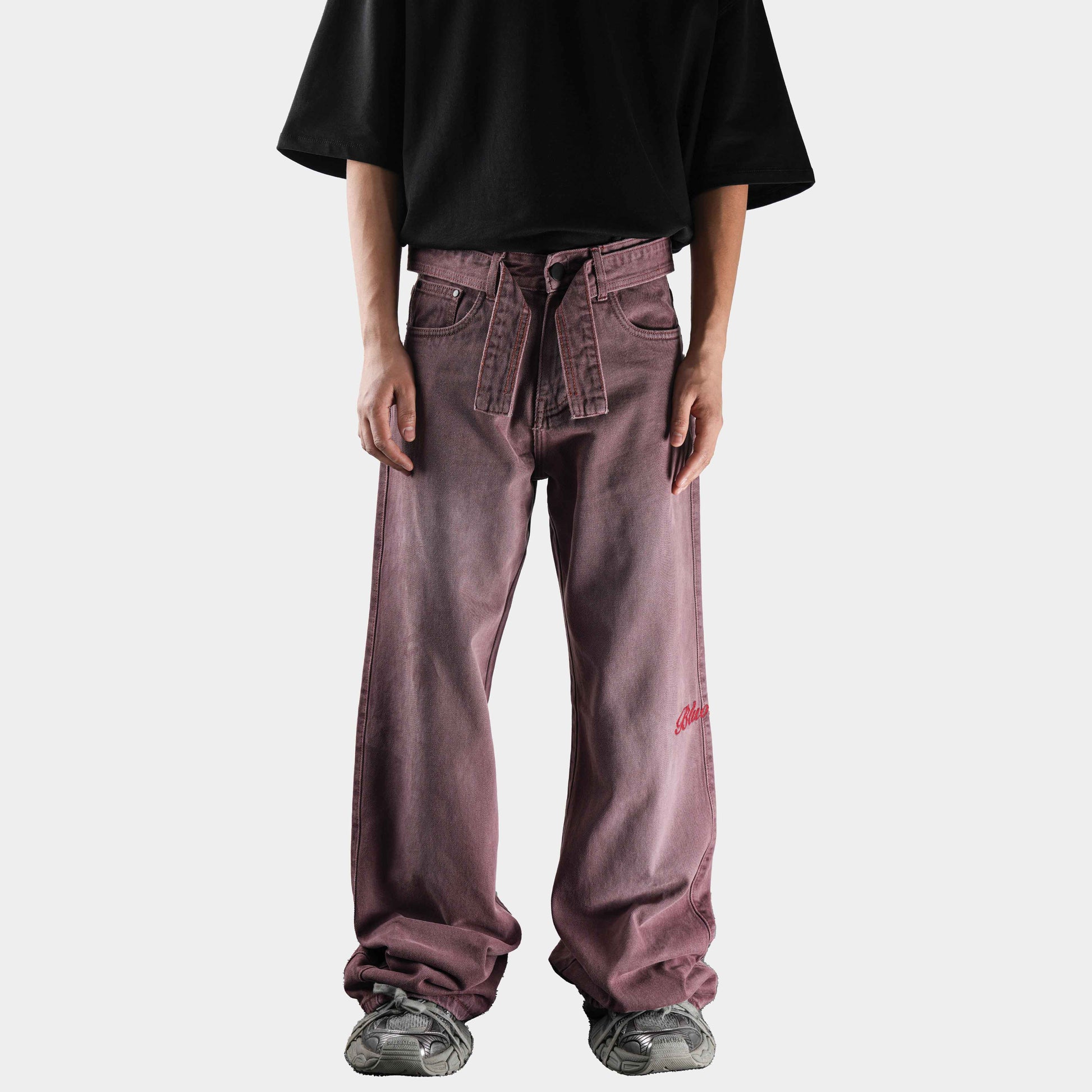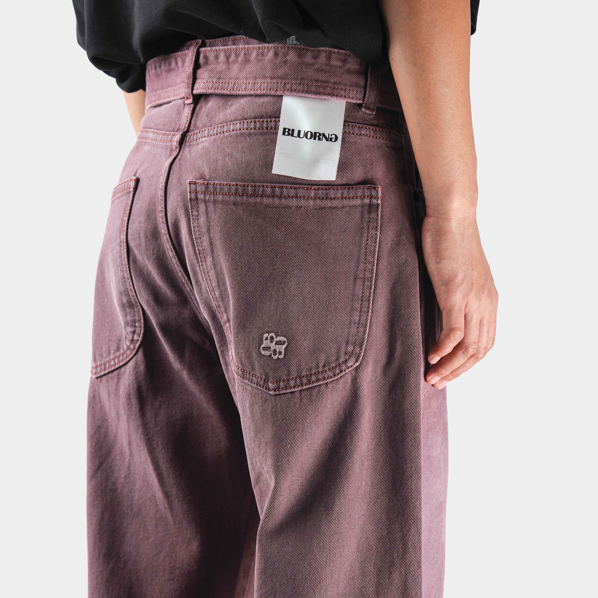 Faded baggy fit jeans with matching fabric belt at the waist. Front pockets and rear patch pocket details. Front button fastening.100% cotton. 14 OZ. Embroidered.