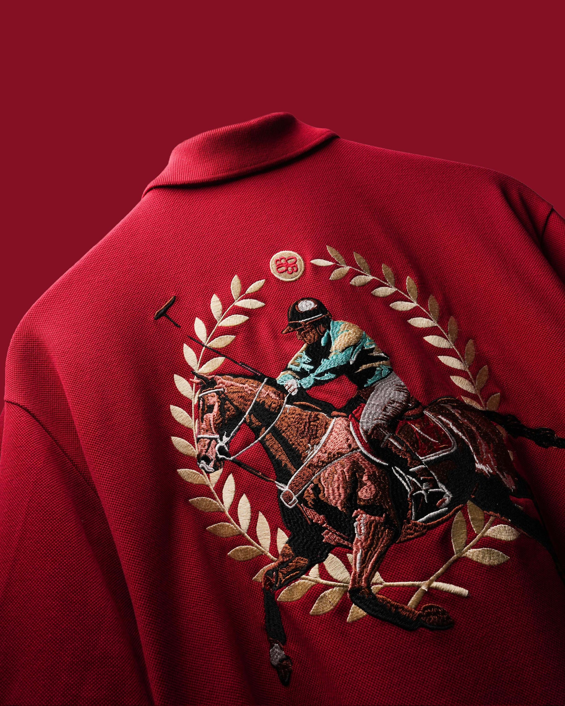 Make a powerful style statement with the Rush Red Saddle League Polo T-Shirt, crafted for those who appreciate bold design and premium quality. Made from 100% cotton with a solid 300 GSM weight, this red cotton polo t-shirt offers a structured feel with everyday comfort. The detailed saddle league embroidery adds depth and character, giving this red embroidered polo t-shirt a refined yet striking look.