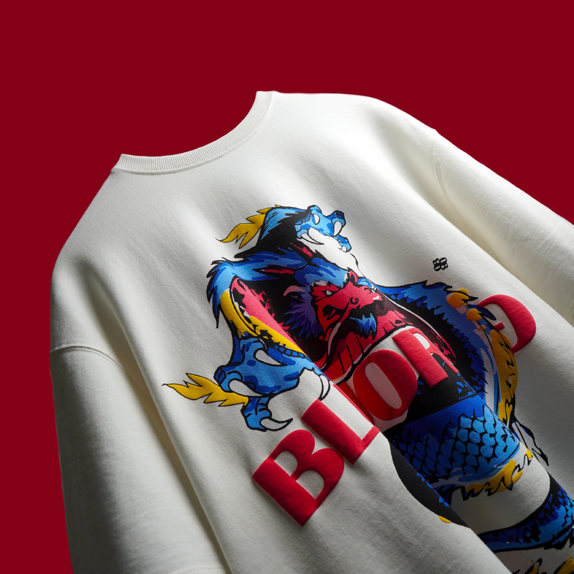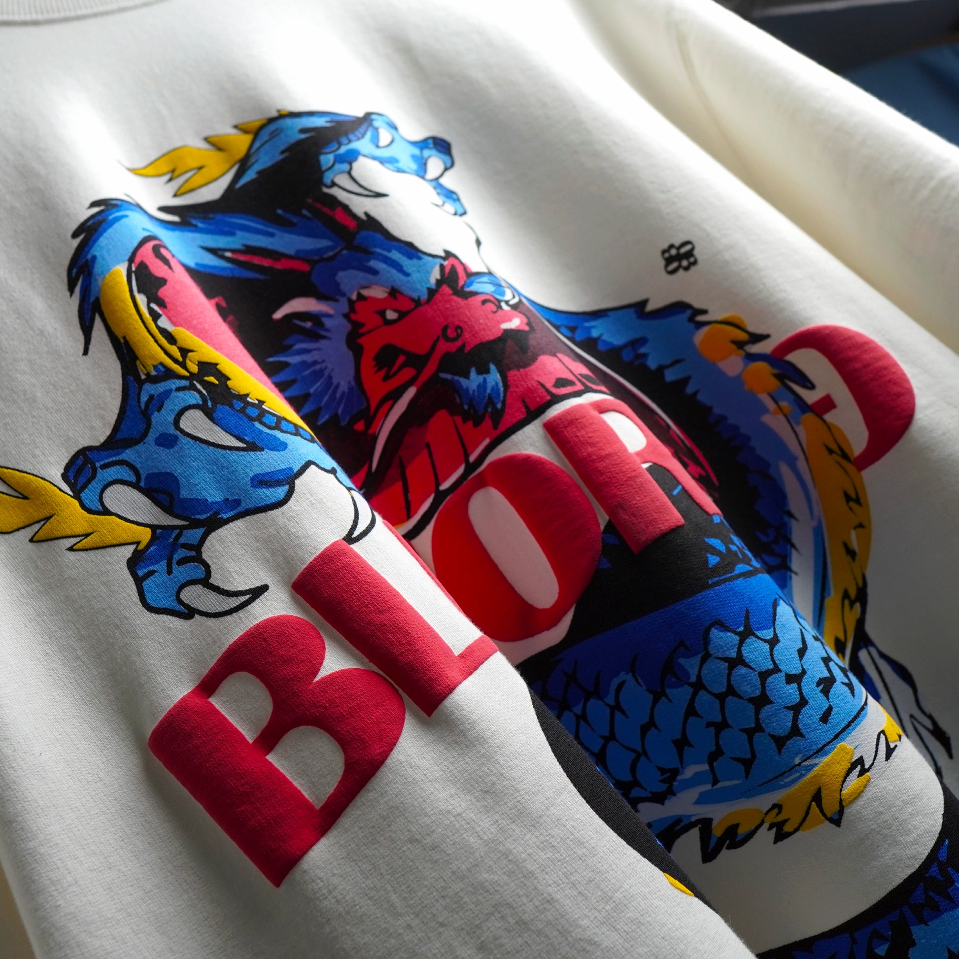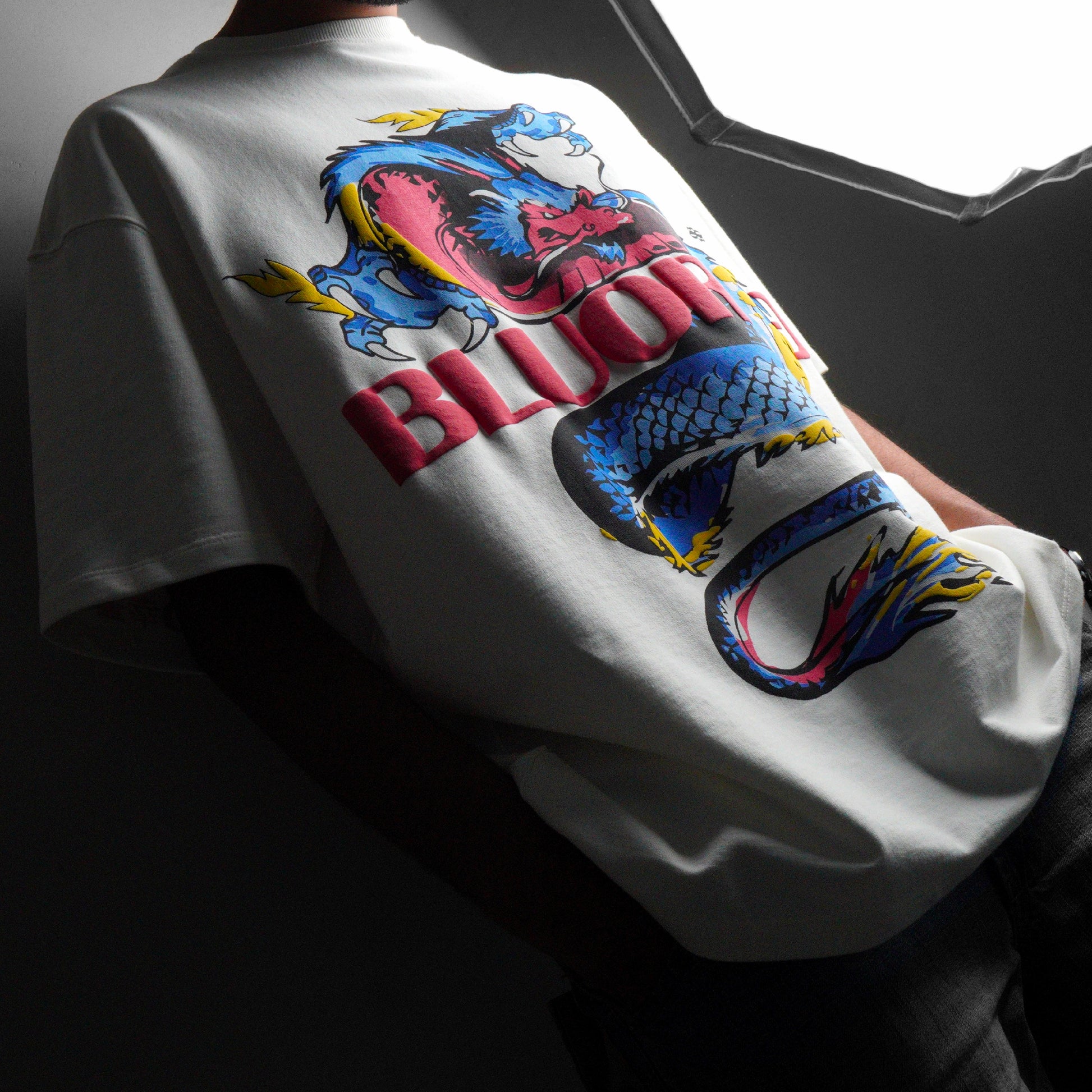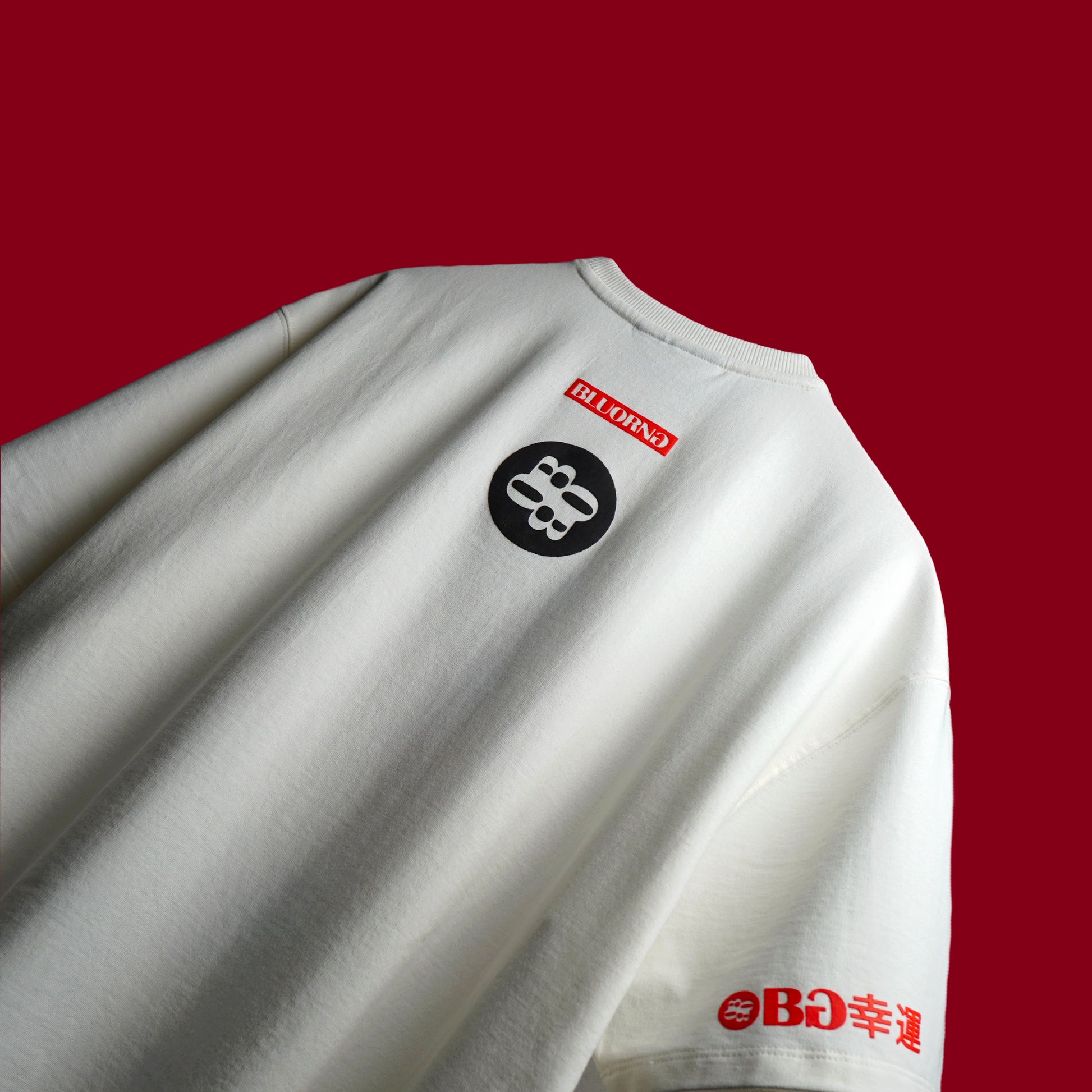 Bluorng Sheron T-shirt is in off-white colour. The design is inspired from dragons and the good fortune they bring. It is 100% terry cotton, 240 gsm and screen printed. The fit is a Bluorng’s signature oversized fit.